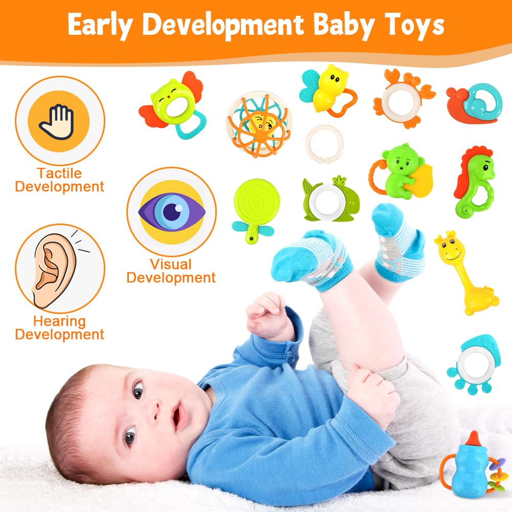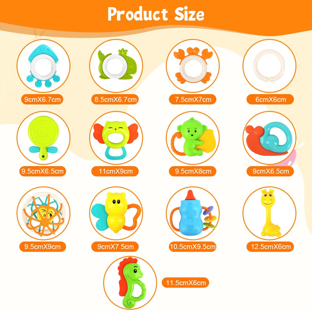 【Early education toys】The set contains 13 baby rattles. Different shapes, colors and shaking sounds can stimulate children’s hearing, curiosity and shape recognition, thereby cultivating children’s coordination ability. Suitable for children aged 0-12 months, it is an excellent choice for early education toys. (Note: The color of the set is random)