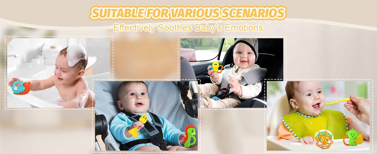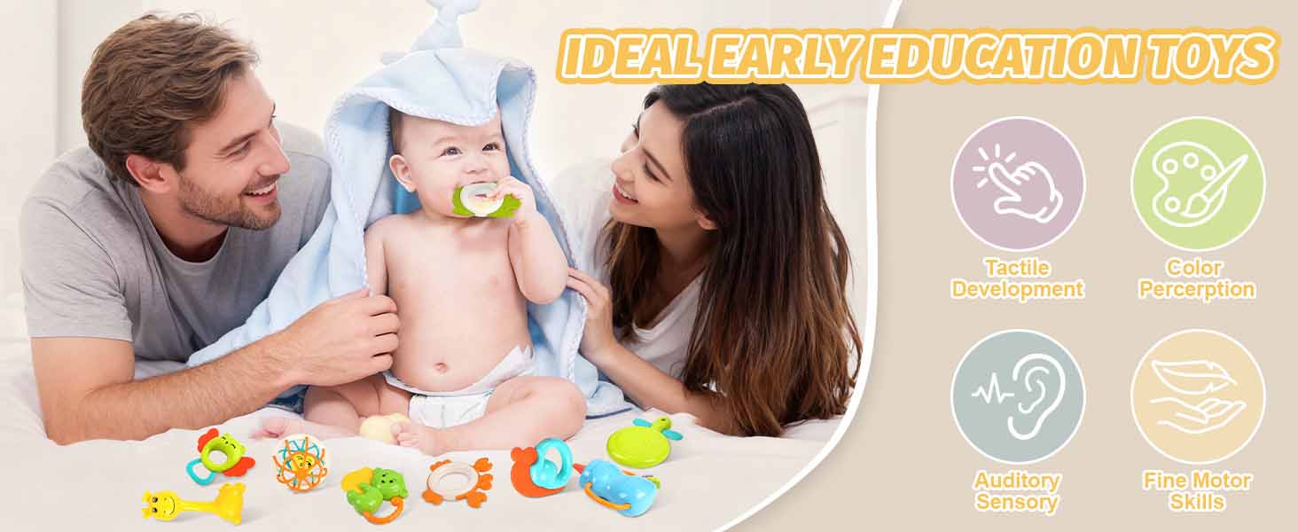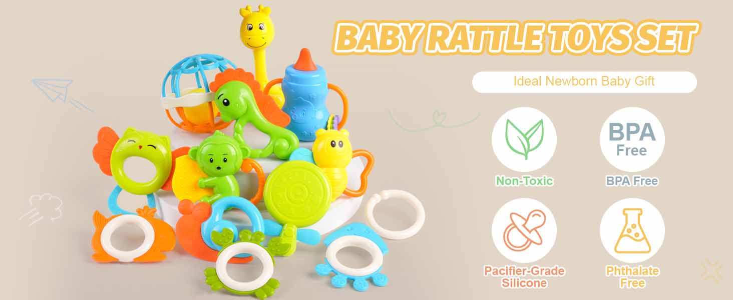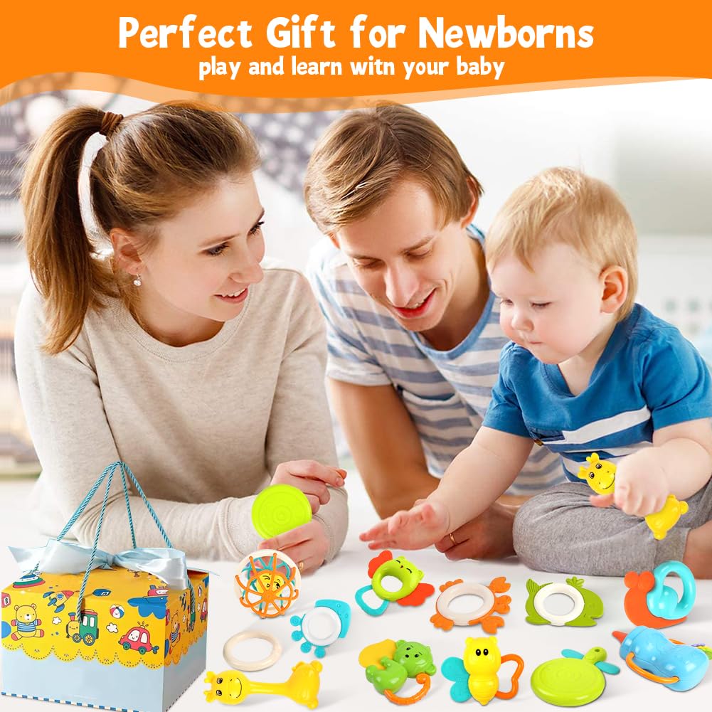 【Multi-sensory function】Vision: 13 baby rattles cover a variety of bright colors, which are very suitable for baby’s color recognition; hearing: The rattles make pleasant sounds when shaking, which stimulates the baby’s auditory development; touch: The different shapes of the rattles will attract your baby to touch, grab and observe them.