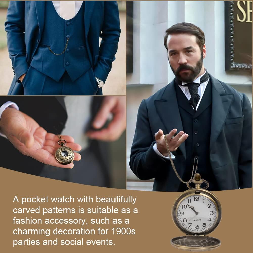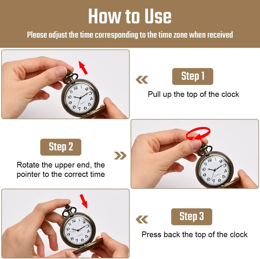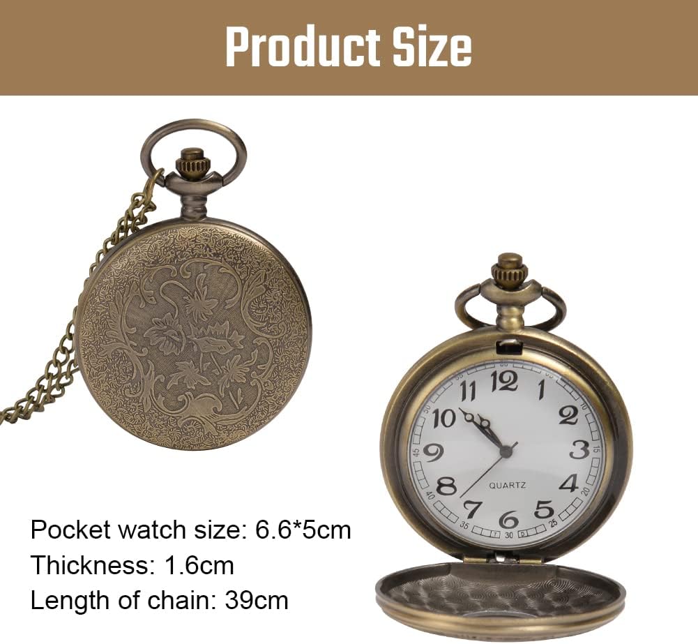The package includes a pocket watch and a necklace chain with hook; the detachable chain is easy to assemble and disassembleThe diameter of this pocket watch is about 5 cm/1.97 inches, the chain length is 39 cm/15.35 inches, and the total length is about 78 cm/30.71 inches, lightweight and compact, easy to carry and storeThis men’s pocket watch with chain is made of zinc alloy, not easy to rust and damage, elegant design with precise quartz movement, the color of the dial is white, the hour, minute and second hands are accurate, full of retro atmosphereThere is a button on the top of the pocket watch, pull out the button when you open the pocket watch, turn it clockwise to set the time.Pocket watch for men can be a chic gift for your husband, son, family or friends as a birthday, Christmas, wedding or anniversary, Father’s Day or party decoration
